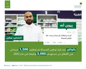 قالت وزارة الموارد البشرية والتنمية الاجتماعية إنه تم توظيف 1500 صيدلي، في القطاع، منذ صدور ‏قرار التوطين بالنشاط.