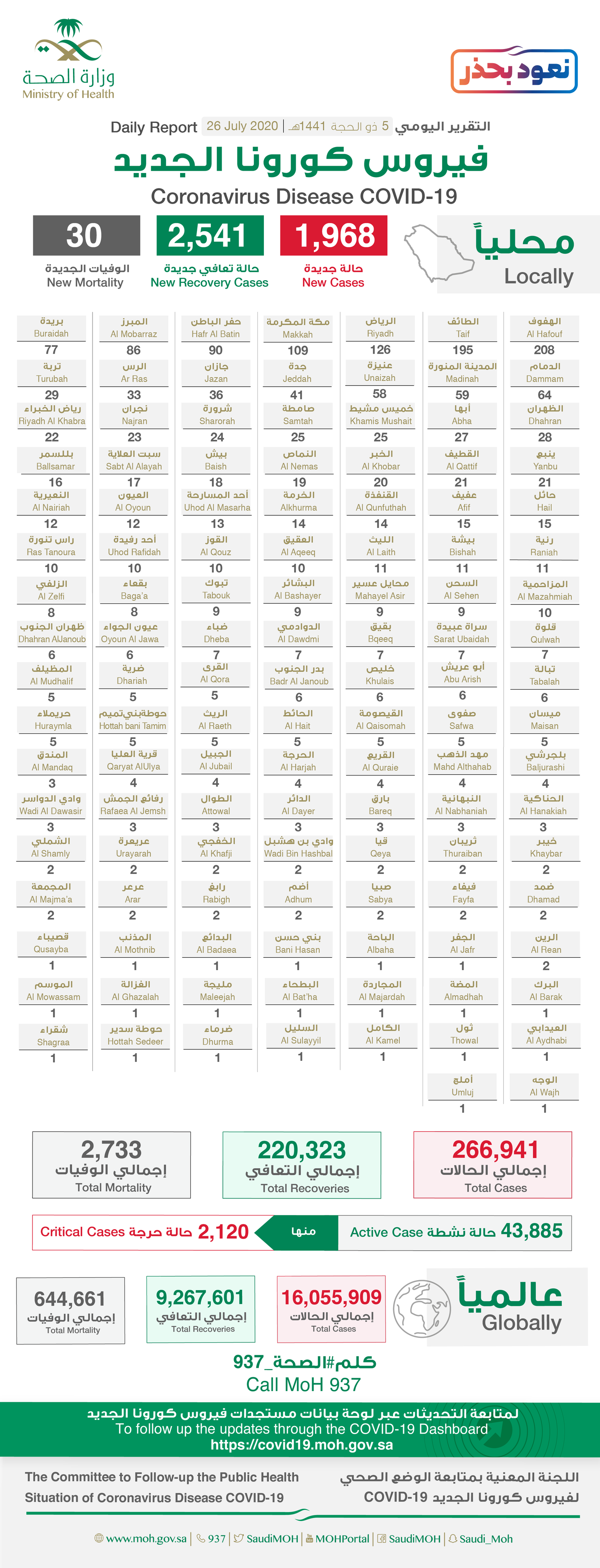 أعلنت وزارة الصحة، اليوم الأحد 26 يوليو 2020، تسجيل 1968 حالة إصابة جديدة بفيروس كورونا الجديد (كوفيد-19) ليصبح الإجمالي 266941حالة .