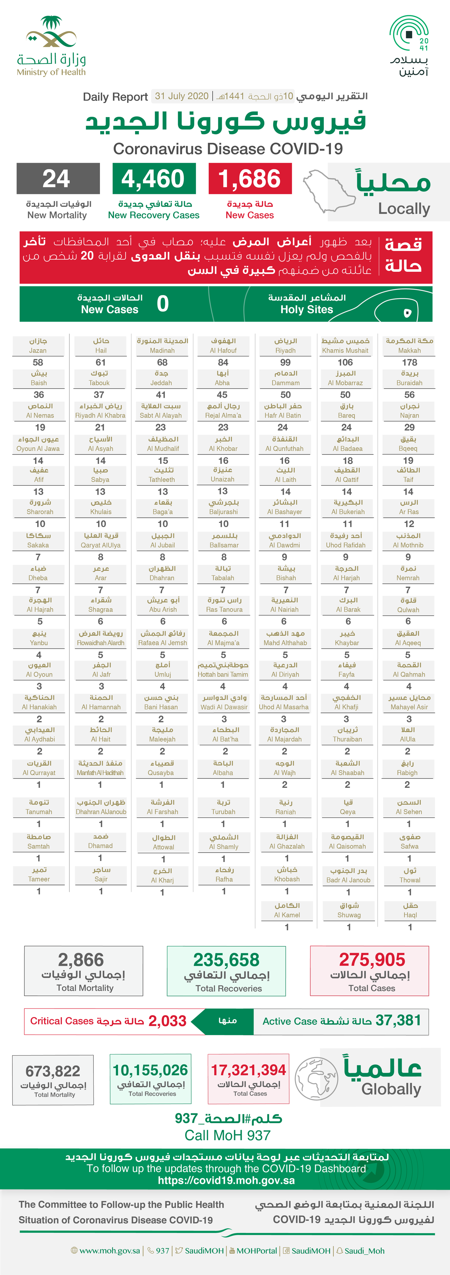 أعلنت وزارة الصحة، اليوم الجمعة 31 يوليو 2020، تسجيل 4460 حالة تعاف جديدة من فيروس كورونا الجديد (كوفيد-19) ليصبح الإجمالي 235658 حالة ولله الحمد.