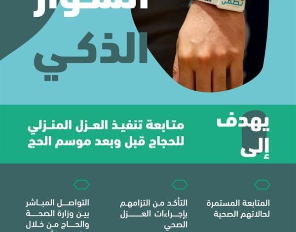 وأشارت في رسالة توعوية إلى أن استعمال السوار يهدف إلى متابعة تنفيذ العزل المنزلي للحجاج قبل وبعد موسم الحج، لمتابعة حالتهم الصحية، والتأكد من التزامهم بإجراءات العزل، بالإضافة إلى أن تطبيق” تطمن” يتيح التواصل بين وزارة الصحة والحاج.