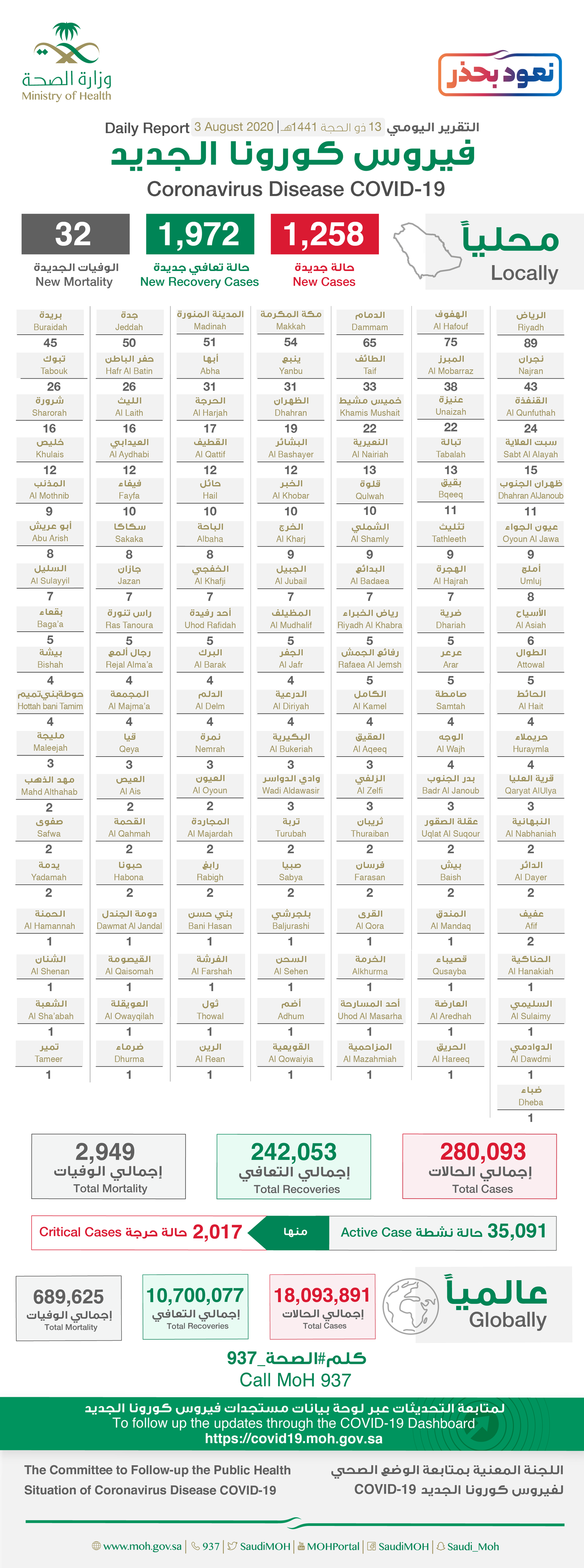 أعلنت وزارة الصحة، اليوم الاثنين 03 أغسطس 2020، تسجيل 1972 حالة تعاف جديدة من فيروس كورونا الجديد (كوفيد-19) ليصبح الإجمالي 242053 حالة ولله الحمد.