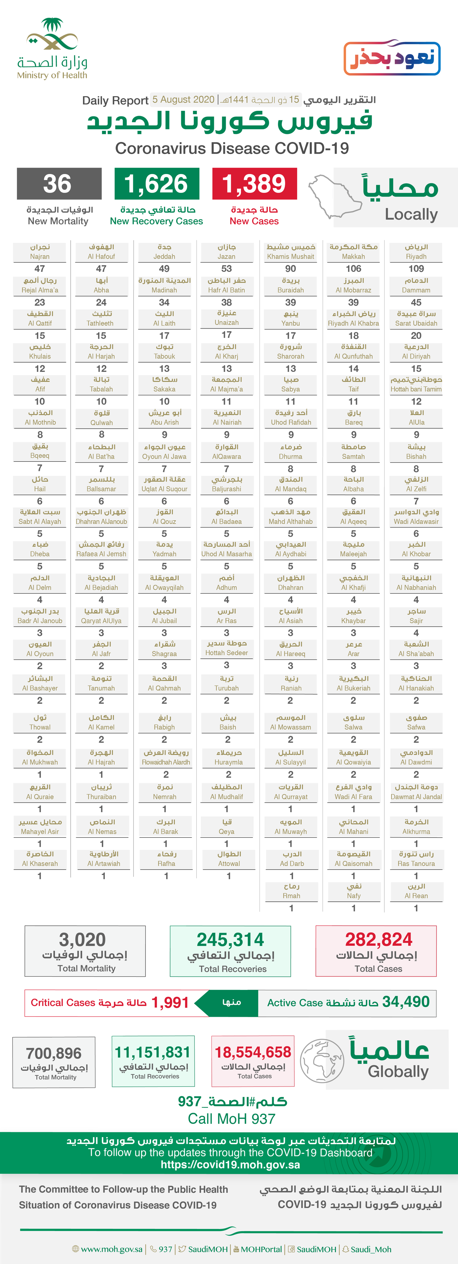 أعلنت وزارة الصحة، اليوم الأربعاء 5 اغسطس 2020، تسجيل 1626 حالة تعاف جديدة من فيروس كورونا الجديد (كوفيد-19) ليصبح الإجمالي 245314 حالة ولله الحمد.