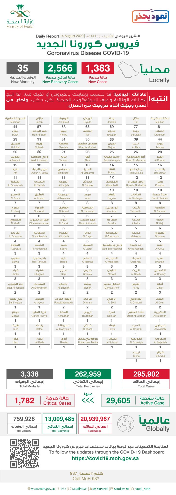 أعلنت وزارة الصحة، اليوم الجمعة 14 أغسطس 2020، تسجيل 2566 حالة تعاف جديدة من فيروس كورونا الجديد (كوفيد-19) ليصبح الإجمالي 262959 حالة ولله الحمد.