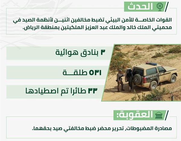 تمكنت القوات الخاصة للأمن البيئي، اليوم (الجمعة)، من ضبط مخالفين اثنين لأنظمة الصيد في محميتي الملك خالد والملك عبدالعزيز الملكيتين في منطقة الرياض.