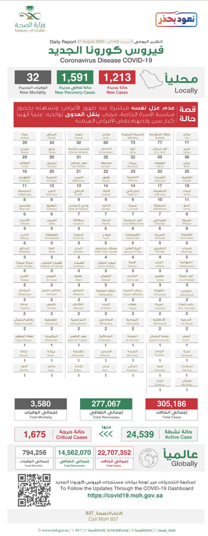 ويوضح الجدول المرفق توزيع الحالات الجديدة في مدن المملكة، وكذلك أعداد الإصابة والتعافي والوفيات عالمياً.