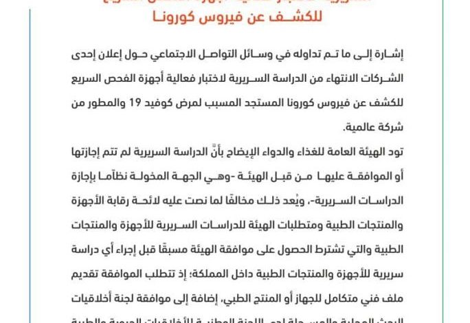 أكدت الهيئة العامة للغذاء والدواء، أنّ الدراسة السريرية التي أعلنت عنها إحدى الشركات حول الانتهاء من اختبار فعالية أجهزة الفحص السريع للكشف عن فيروس كورونا المستجد المسبب لمرض (كوفيد19) والمطور من شركة عالمية، لم تُجزْ أو يُوافق عليها من قبل الهيئة، وهي الجهة المخولة نظامًا بإجازة الدراسات السريرية.