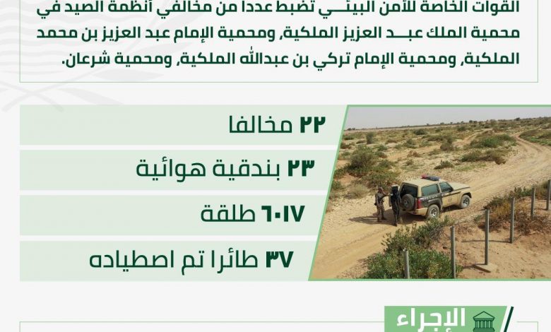 تمكنت القوات الخاصة للأمن البيئي من ضبط عدد من مخالفي أنظمة الصيد في محمية الملك عبدالعزيز الملكية، ومحمية الإمام عبدالعزيز بن محمد الملكية.