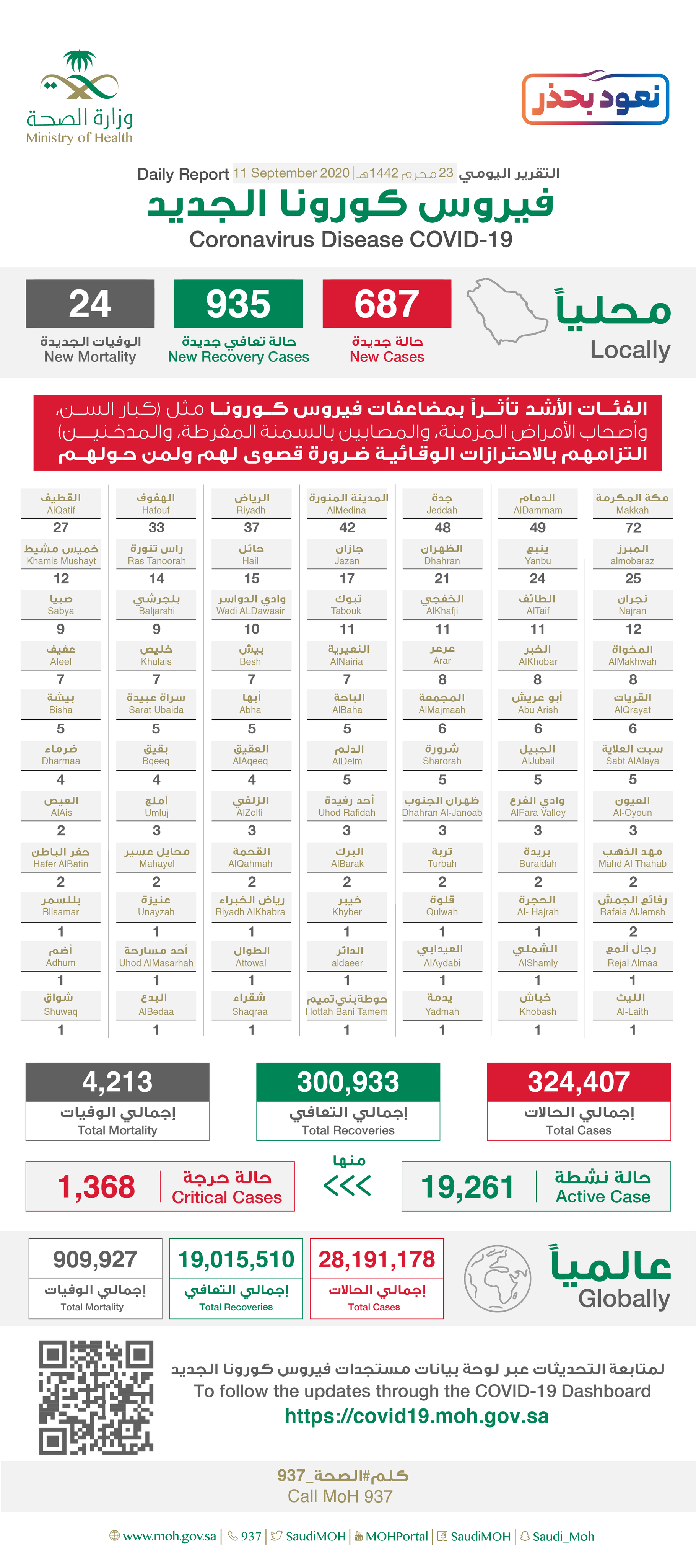 أعلنت وزارة الصحة، اليوم الجمعة 11 سبتمبر 2020، تسجيل 687 حالة إصابة جديدة بفيروس كورونا الجديد (كوفيد-19) ليصبح الإجمالي 324407 حالة .