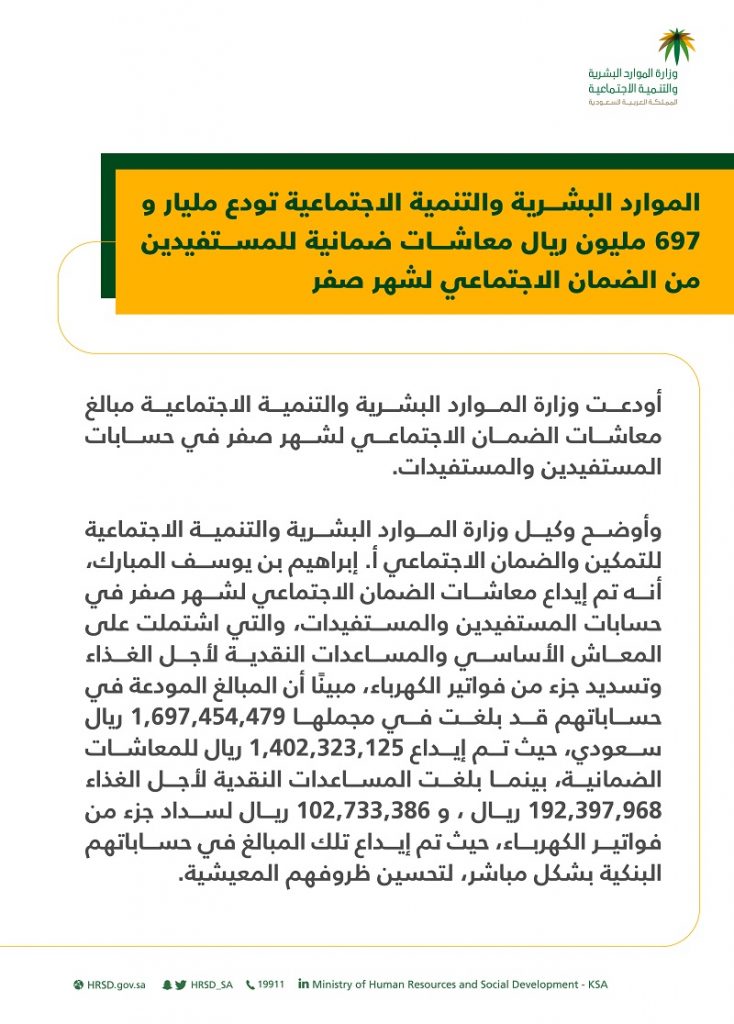 أعلنت وزارة الموارد البشرية والتنمية الاجتماعية، اليوم (الخميس)، إيداع معاشات الضمان الاجتماعي لشهر صفر في حساب المستفيدين والمستفيدات.