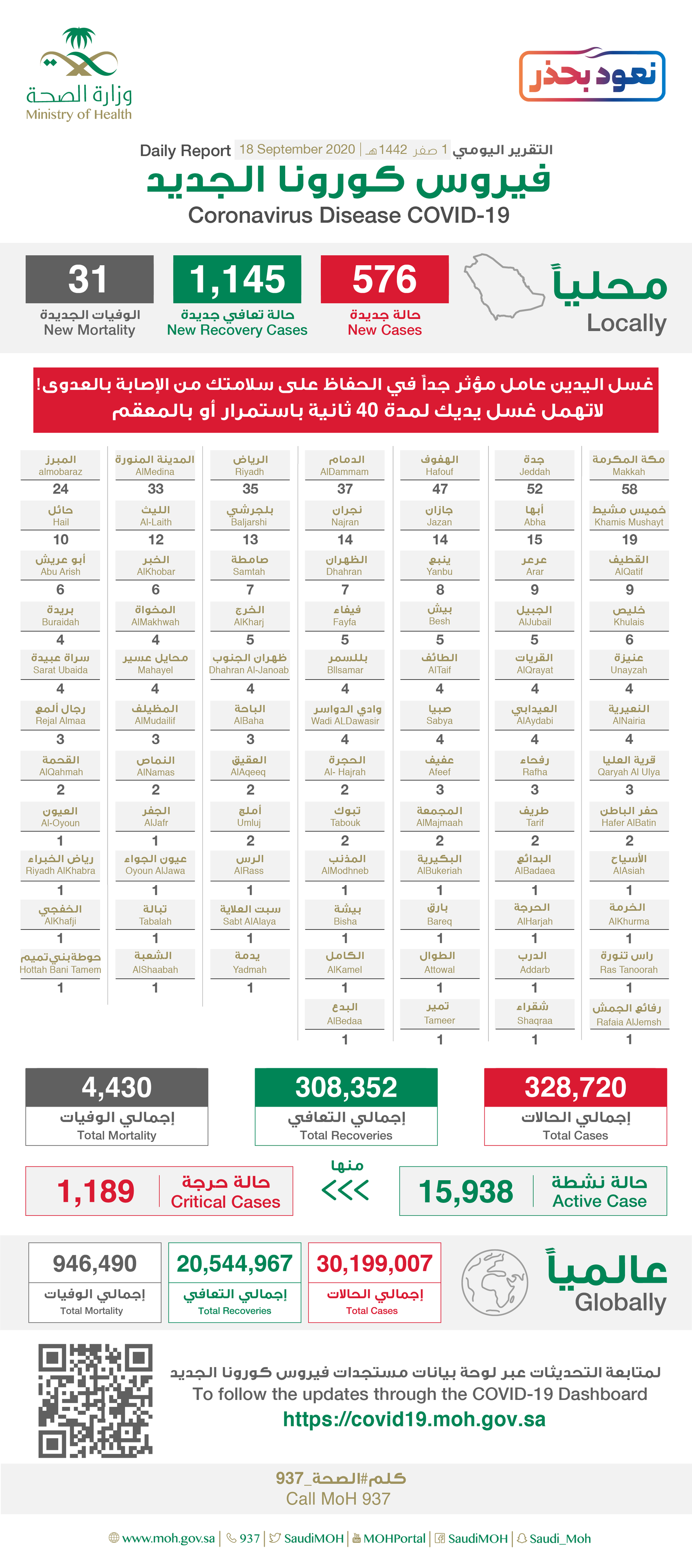 وأبانت أنه تم تسجيل 1145 حالة تعافٍ جديدة، ليصل إجمالي عدد المتعافين إلى 308352 حالة، لافتة إلى أن هناك 15938 حالة نشطة حالياً، من بينها 1189 حالة حرجة.