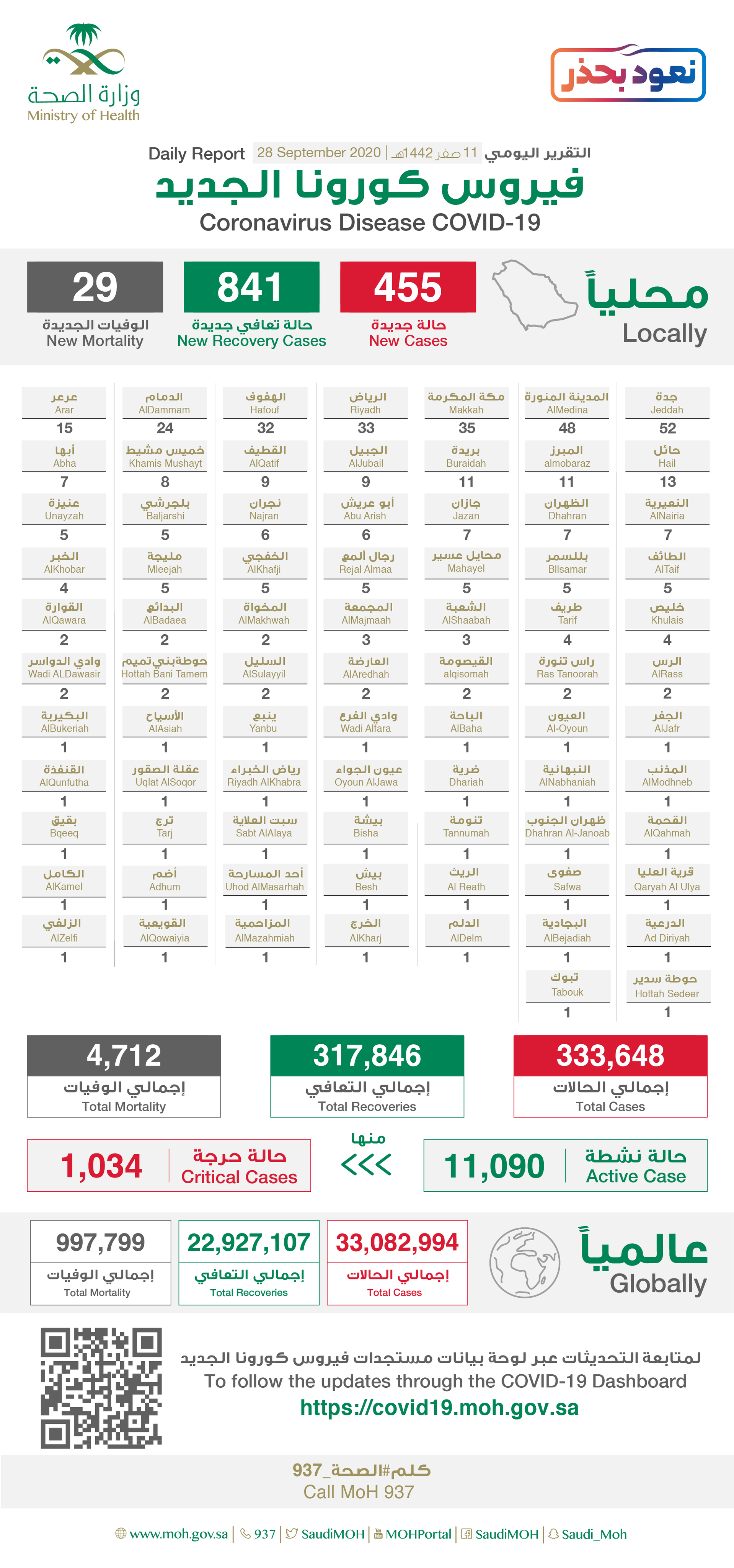 وقالت الوزارة، خلال التقرير اليومي الخاص بمستجدات فيروس كورونا في المملكة، إنه تم تسجيل 29 حالة وفاة جديدة، ليرتفع إجمالي الوفيات جراء الفيروس إلى 4712 حالة وفاة.
