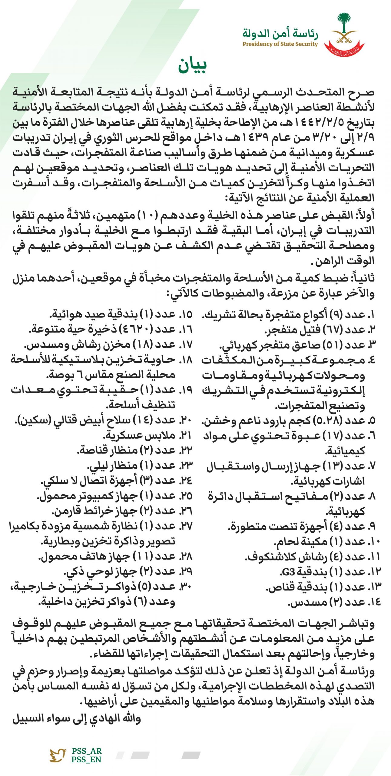 صرَّح المُتحدث الرسمي لرئاسة أمن الدولة، بأنه نتيجة المتابعة الأمنية لأنشطة العناصر الإرهابية، فقد تمكنت ـ بفضل الله ـ الجهات المختصة بالرئاسة بتاريخ 5 / 2 / 1442هـ، من الإطاحة بخلية إرهابية تلقى عناصرها خلال الفترة ما بين 9 / 2 إلى 20 / 3 من عام 1439هـ، داخل مواقع للحرس الثوري في إيران تدريبات عسكرية وميدانية من ضمنها طرق وأساليب صناعة المتفجرات، حيث قادت التحريات الأمنية إلى تحديد هويات تلك العناصر، وتحديد موقعين لهم اتخذوا منها وكراً لتخزين كميات من الأسلحة والمتفجرات، وقد أسفرت العملية الأمنية عن النتائج الآتية: