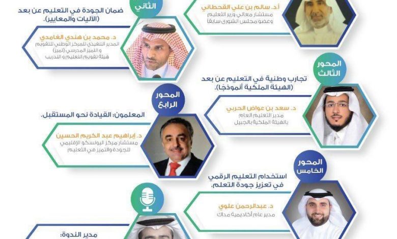 بعد ذلك انطلقت الندوة المباشرة بعنوان (التعليم عن بعد وجودة التعلم) التي أدارها د. صلاح بن صالح معمار أستاذ القيادة التعليمية المشارك بجامعة طيبة حيث تحدث في المحور الأول أ.د سالم بن علي القحطاني مستشار معالي وزير التعليم وعضو مجلس الشورى سابقًا عن (جودة التعليم عن بعد، الآمال والتوقعات) ، ثم تحدث د. محمد بن هندي الغامدي المدير التنفيذي للمركز الوطني للتقويم و التميز المدرسي (تميز) عن ضمان الجودة في التعليم عن بعد (الآليات والمعايير) ، بعد ذلك قدّم مدير إدارة التعليم العام بالهيئة الملكية بالجبيل د. سعد بن عواض الحربي المحور الثالث في الندوة: تجارب وطنية في التعليم عن بعد (الهيئة الملكية أنموذًجاً) ، فيما قدّم د. إبراهيم عبد الكريم الحسين مستشار مركز اليونسكو الإقليمي للجودة والتميز في التعليم المحور الرابع الذي جاء بعنوان المعلمون : القيادة نحو المستقبل.