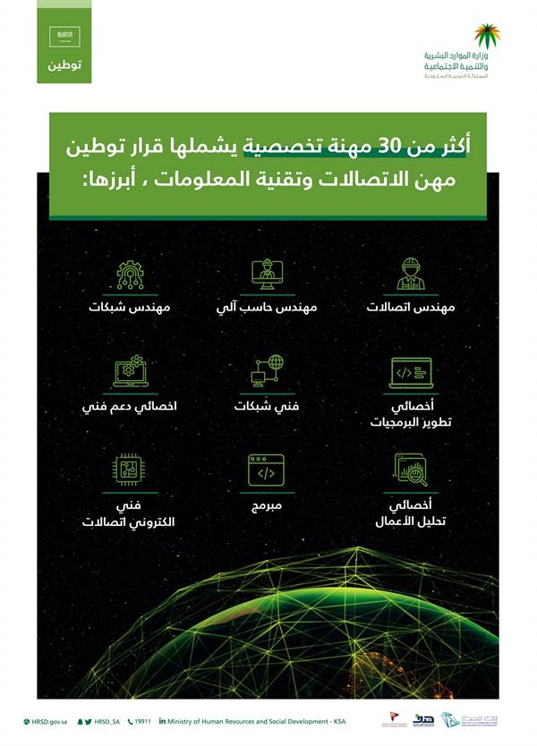 وذكرت الوزارة أن أبرز المهن التي يشملها قرار التوطين هى: أخصائي تحليل الأعمال، ومهندس اتصالات، مهندس شبكات، ومهندس حاسب آلي، فني شبكات، وأخصائي دعم فني، ومبرمج، وأخصائي تطوير برمجيات.