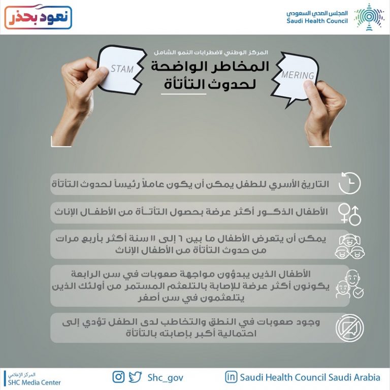 أوضح المجلس الصحي السعودي، أن الأطفال الذكور معرضون للتأتأة أكثر من الإناث، مشيرًا إلى أن التاريخ الأسري للطفل يلعب دورًا كبيرًا في حدوثها، وذلك بمناسبة الاحتفال باليوم العالمي للتأتاة.
