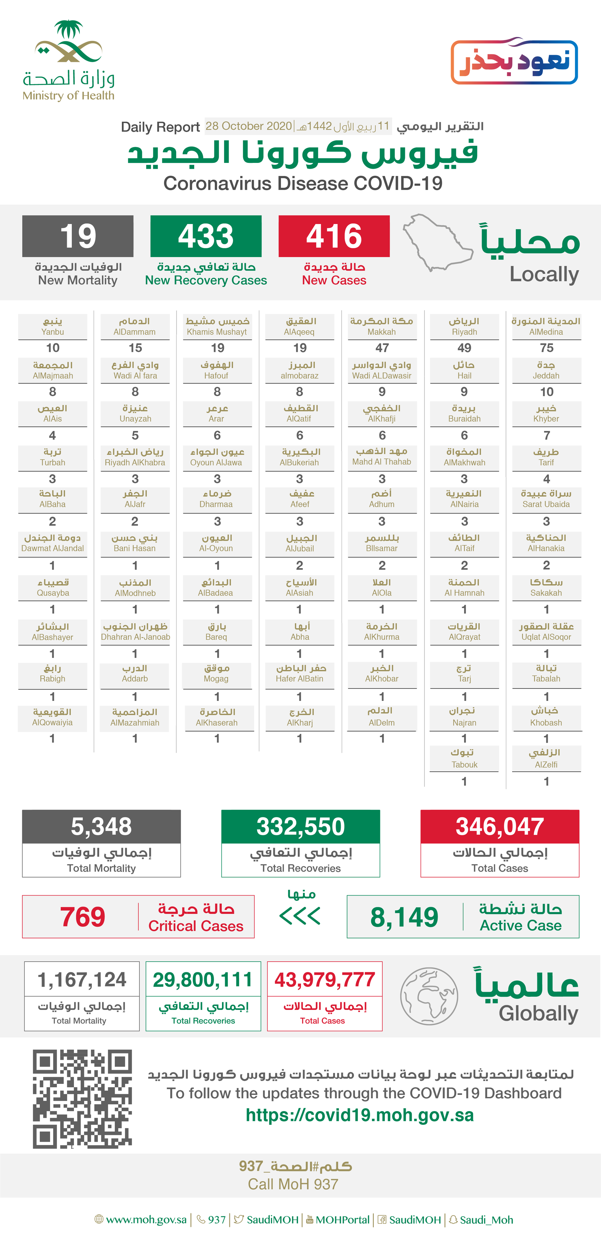 وقالت الوزارة أنه تم تسجيل ٤٣٣ حالة تعاف جديدة ليصبح الإجمالي ٣٣٢٥٥٠ حالة ولله الحمد.