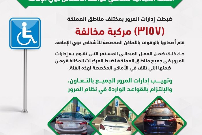 أعلنت الإدارة العامة للمرور عن ضبط 3157 مركبة مخالفة في جميع أنحاء المملكة قام أصحابها بالوقوف بالأماكن المخصصة للأشخاص ذوي الإعاقة.