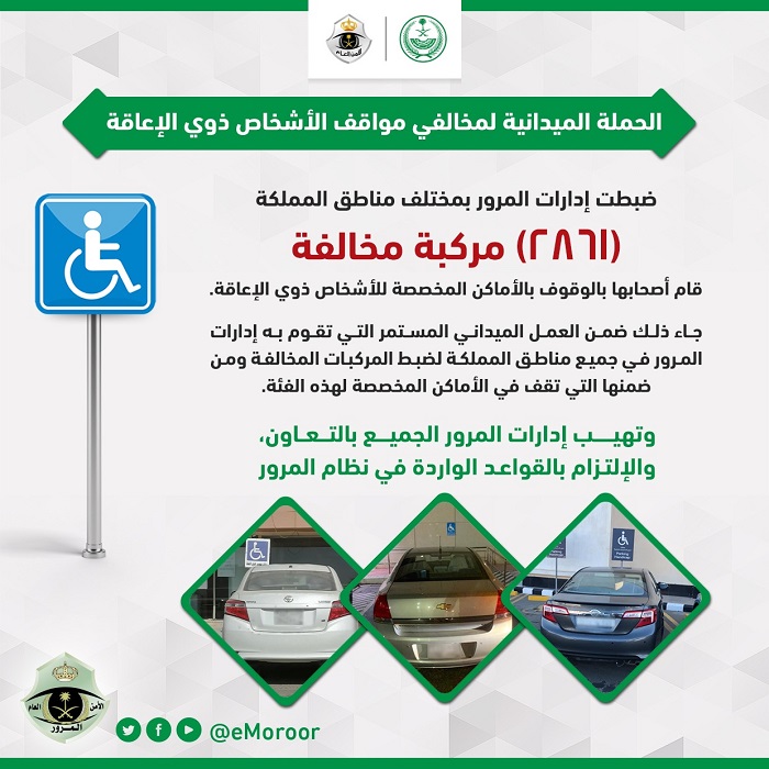 أعلنت الإدارة العامة للمرور، ضبط 2861 مركبة مخالفة، بالوقوف في الأماكن المُخصصة للأشخاص ذوي الإعاقة، بمختلف مناطق المملكة.