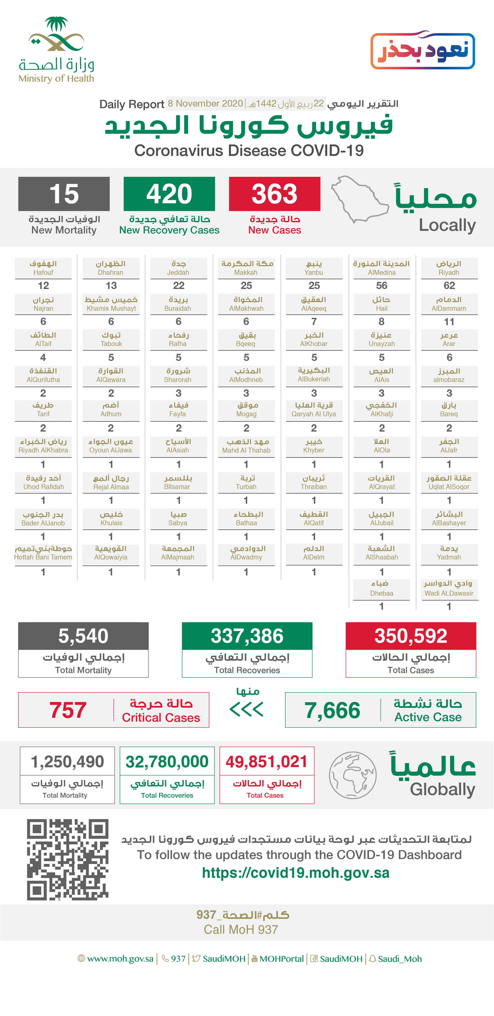 وقالت الوزارة أنه تم تسجيل 420 حالة تعاف جديدة ليصبح الإجمالي 337386 حالة ولله الحمد.