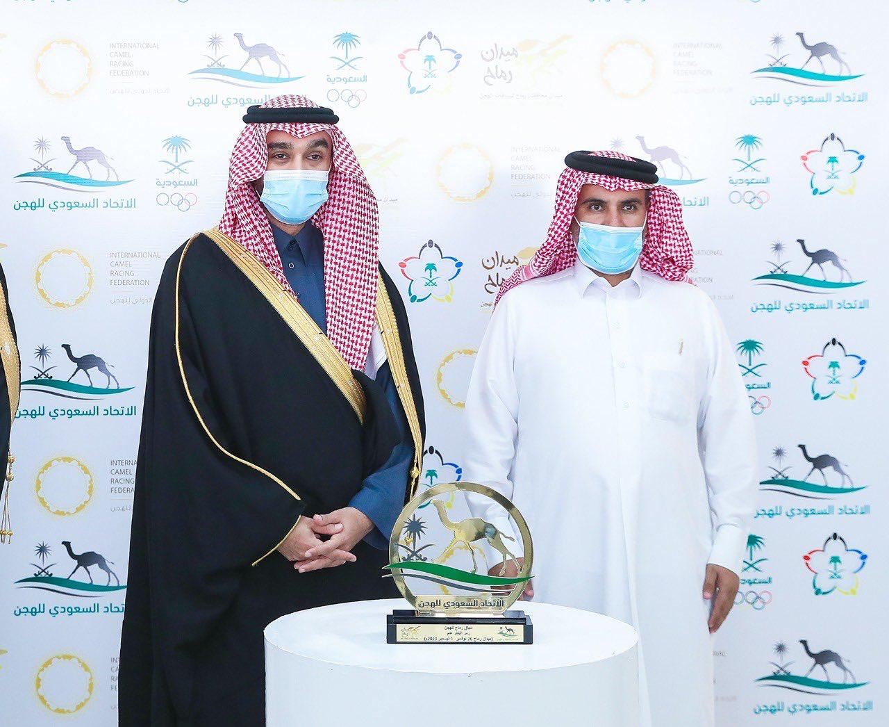 توج صاحب السمو الملكي الأمير عبد العزيز بن تركي الفيصل وزير الرياضة، رئيس اللجنة الأولمبية العربية السعودية ورئيس الاتحاد الدولي للهجن، وبحضور صاحب السمو الأمير فهد بن جلوي بن عبدالعزيز بن مساعد، رئيس مجلس إدارة الاتحاد السعودي للهجن، الفائزين الأوائل في سباق رماح للهجن في اليوم الختامي للمنافسات، التي شهدت سباق “الماراثون بكار – حيل”، و”الماراثون قعدان – زمول”، وأشواط “رموز الزمول”، و أشواط “رموز الحيل”.