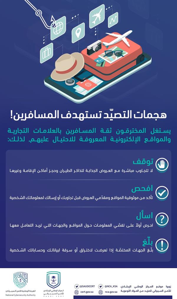 ودعا المركز المسافرين إلى التأكد من موثوقية المواقع ومقدمّي العروض قبل التجاوب معها أو إرسال معلوماتهم الشخصية، مشدداً على ضرورة أن يتواصل المسافر مع الجهات المختصّة في حال اختراق أو سرقة بياناته وحساباته الشخصية.