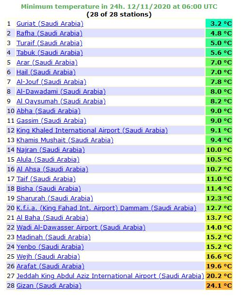 وقال المسند إن القريات تصدرت القائمة بتسجيلها أدنى درجة حرارة في المملكة بـ 3.2 درجة مئوية، بينما حلت رفحاء في المرتبة الثانية بدرجة حرارة بلغت 4.8 درجة مئوية، في حين بلغت درجة الحرارة في طريف 5 درجات مئوية.