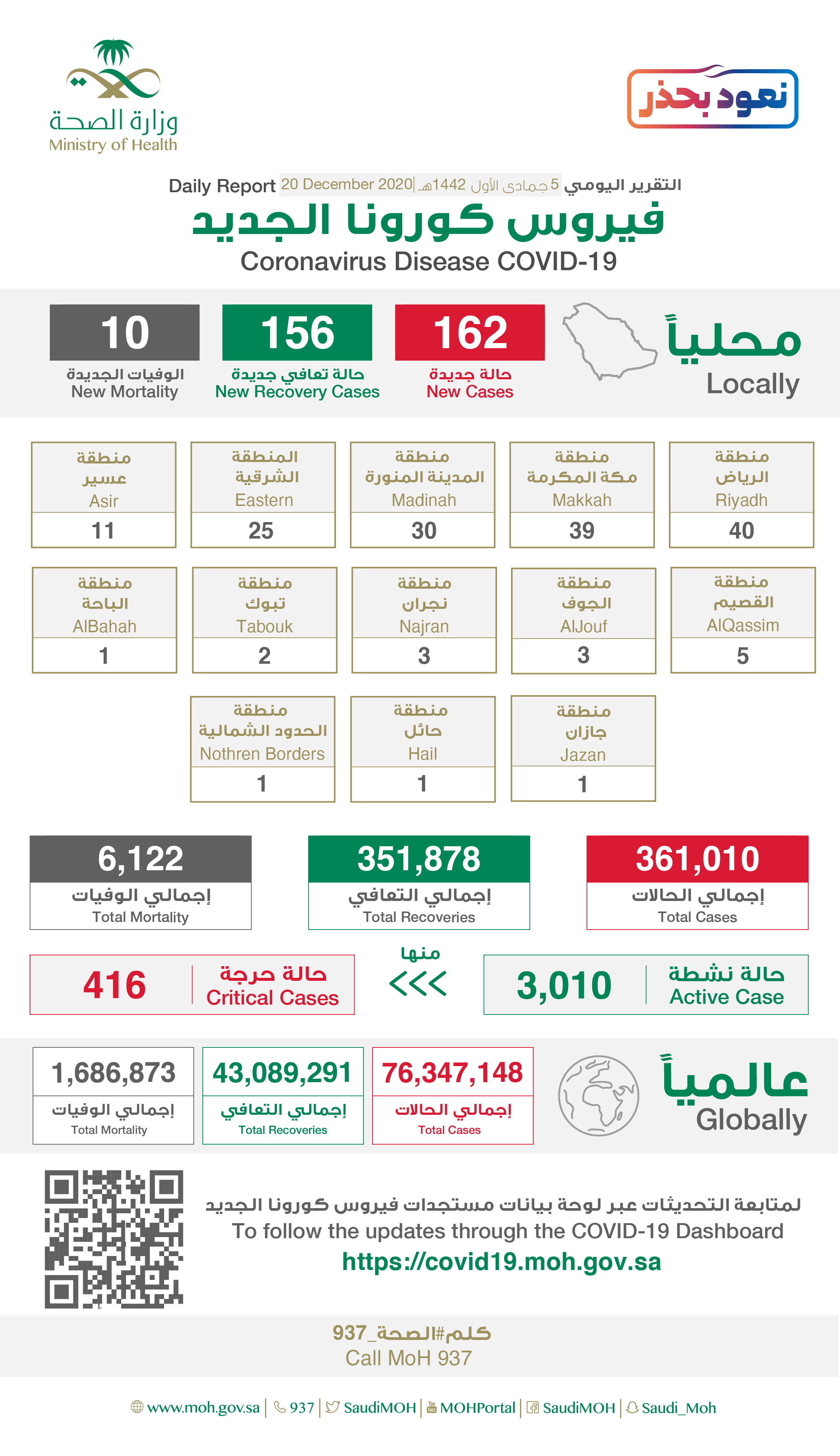 وكشفت الوزارة أن عدد الحالات النشطة بلغ 3010 والحالات الحرجة 416 حالة.