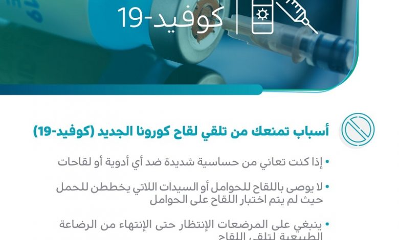 وأوضح أنه يُمنع من تلقي لقاح كورونا إذا كان المرء يعاني حساسية شديدة ضد أي أدوية أو لقاحات، كما لا يُوصى باللقاح للحوامل أو السيدات اللاتي يخططن للحمل.