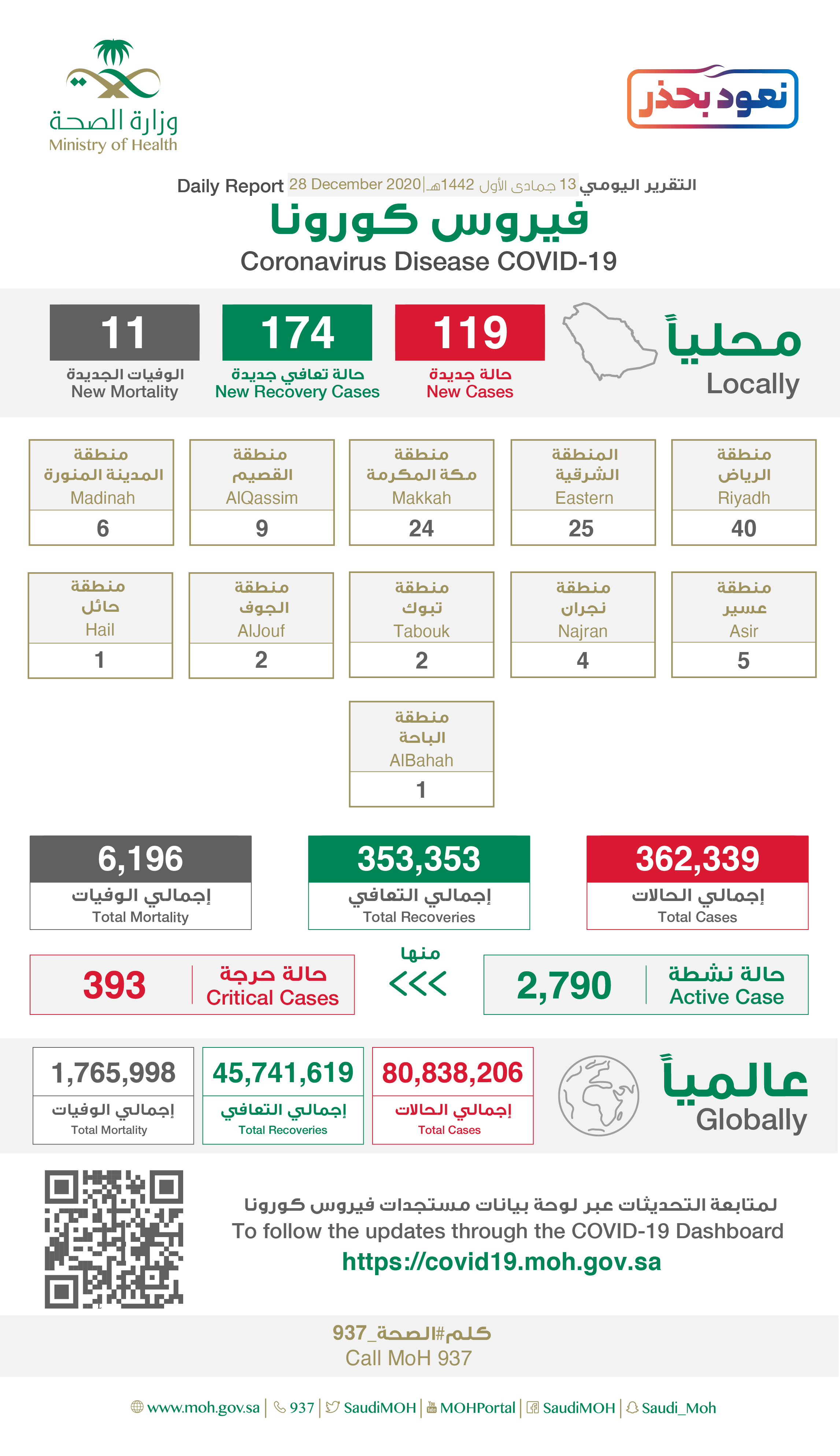أعلنت وزارة الصحة، اليوم الاثنين 28 ديسمبر 2020، تسجيل 119 حالة إصابة جديدة بفيروس كورونا الجديد (كوفيد-19)، خلال الـ24 ساعة الماضية، ليصبح الإجمالي 362339حالة .