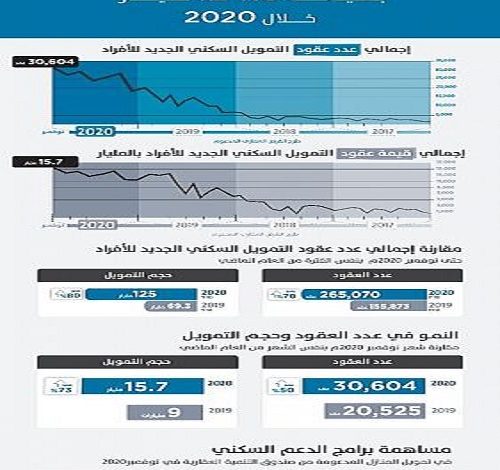 يُذكر أن إحصائيات “ساما” أظهرت نمو في عدد القروض العقارية للأفراد خلال العام الماضي 2019 بمعدلات تجاوزت 3.5 أضعاف ما قُدم من قبل بنحو 179 ألف عقد بقيمة 79.1 مليار، فيما بلغت قروض التمويل بنهاية 2018 نحو 50 ألف عقد بقيمة إجمالية قاربت 29.5 مليار، وفي عام 2017 نحو 30,833 عقد بقيمة زادت عن 21 مليار، وشهد 2016 توقيع 22,259 عقداً تمويلياً بقيمة 17.1 مليار.