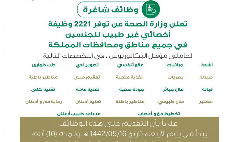 وزارة الصحة تعلن عن 2221 وظيفة أخصائي غير طبيب والصيادلة لحاملي البكالوريوس