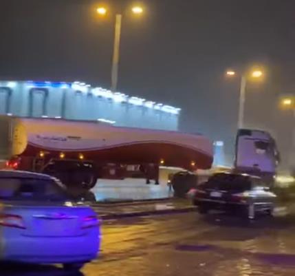 وأظهر المقطع، نافلة الوقود أثناء فقد قائدها السيطرة عليها بسبب مياه الأمطار على الطرق، وانحرافها عن مسارها لتصطدم بمركبات أخرى متوقفة على جانب الطريق، قبل أن تتوقف دون أن تتعرض للانقلاب.
