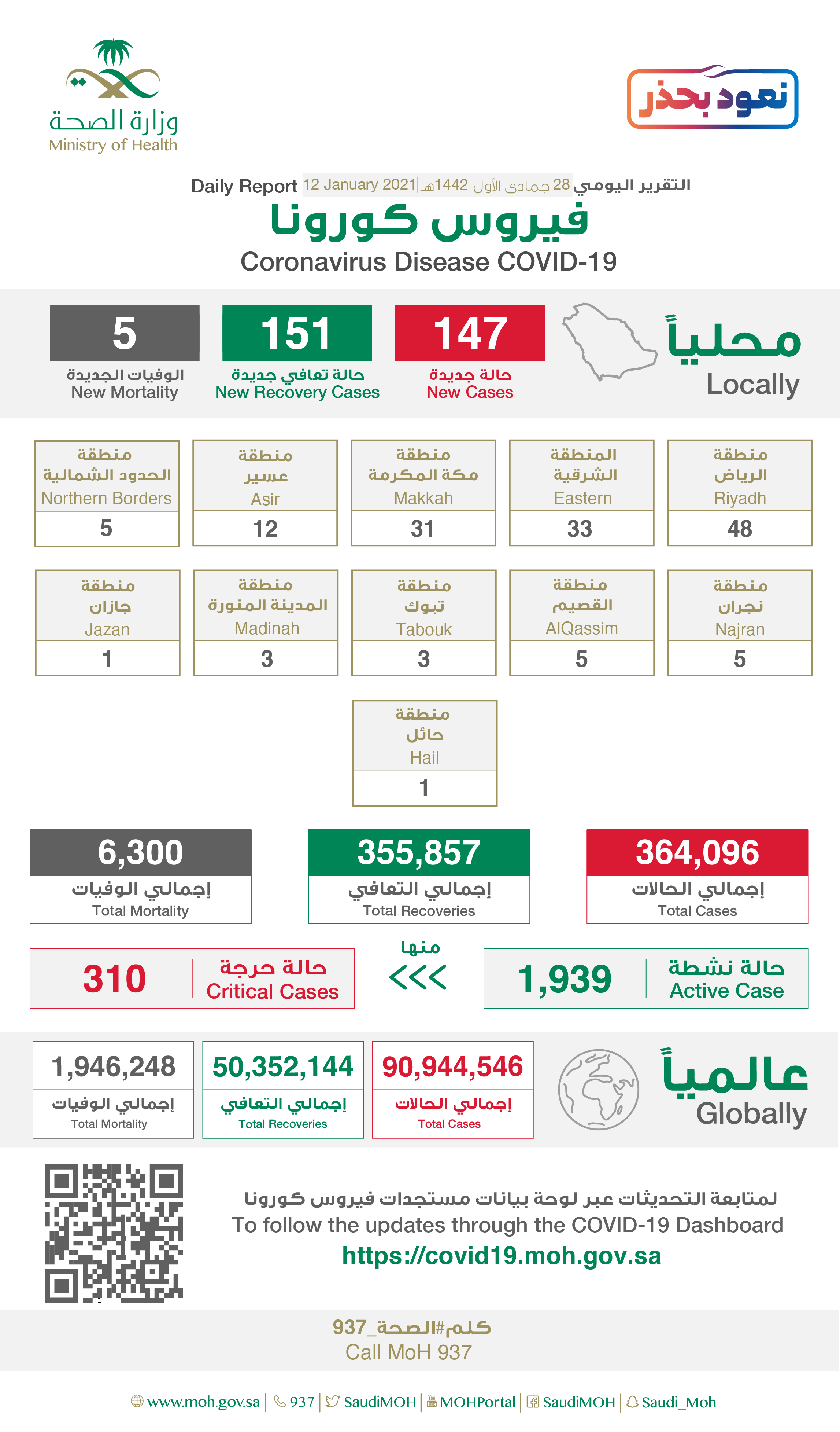 أعلنت وزارة الصحة، اليوم الثلاثاء 12 يناير 2021، تسجيل 147 حالة إصابة جديدة بفيروس كورونا الجديد (كوفيد-19) ليصبح الإجمالي 364096 حالة .