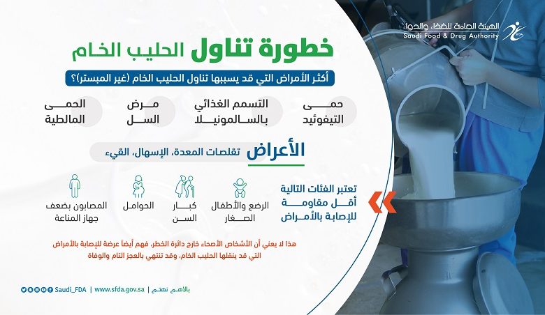 حذرت هيئة الغذاء والدواء من أن تناول الحليب الخام (غير ‏المبستر) يعرض الشخص للإصابة بالعديد من الأمراض ‏الخطيرة، والتي قد تؤدي للوفاة، خاصةً بعض الفئات التي تُعتبر ‏أقل مقاومة للأمراض.‏