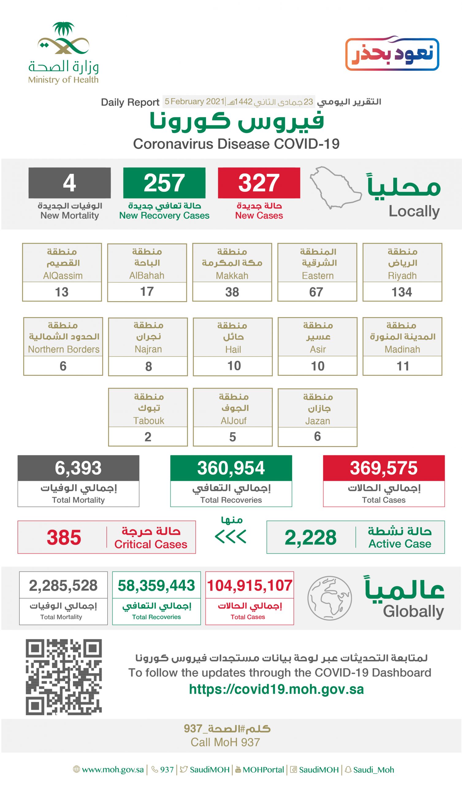 وقالت الوزارة: إنه تم تسجيل 257 حالة تعافٍ جديدة، ليصبح الإجمالي 360954 حالة ولله الحمد.