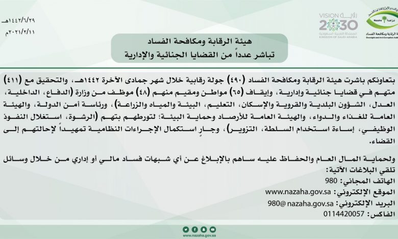 باشرت هيئة الرقابة ومكافحة الفساد (490) جولة رقابية خلال شهر جمادى الآخرة 1442هـ، والتحقيق مع (411) متهم في قضايا جنائية وإدارية، وإيقاف (65) مواطن ومقيم منهم (48) موظف من وزارة الدفاع، الداخلية، العدل، الشؤون البلدية والقروية والإسكان، التعليم، البيئة والمياه والزراعة)، ورئاسة أمن الدولة، والهيئة العامة للغذاء والدواء، والهيئة العامة للأرصاد وحماية البيئة: لتورطهم بتهم (الرشوة ، استغلال النفوذ الوظيفي، إساءة استخدام السلطة، التزوير)، وجار استكمال الإجراءات النظامية تمهيدا لإحالتهم إلى القضاء.