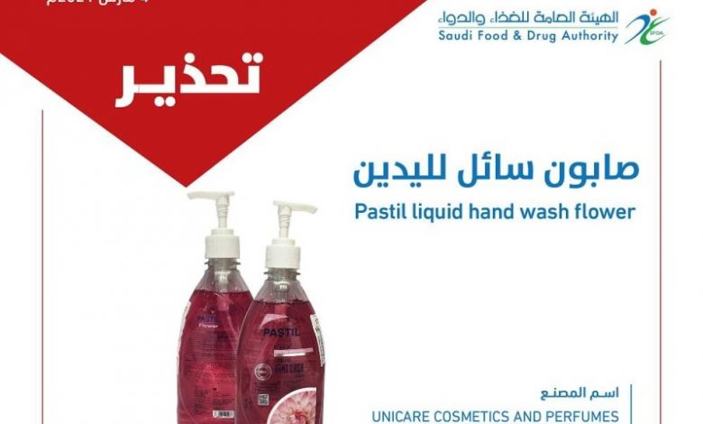 ويحمل المنتج اسم «Pastil liquid hand wash flower»، بتاريخ صلاحية 2024/11/9 ورقم تشغيلة (200114).