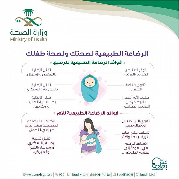 وأبانت ” الصحة ” عبر إنفوجرافيك توعوي نشرته في حسابها على تويتر ومنصتها التوعوية ” عش بصحة ” ، أن الرضاعة الطبيعة لها فوائد من حيث تأمين العناصر الغذائية اللازمة ، وتقوي مناعة الطفل ، كما أن حليب الأم سهل الهضم بعكس الحليب الصناعي ، ويقلل الإصابة بالمغص والإسهال والإصابة بالسمنة والسكري ويقلل الإصابة بحساسية الحليب والإكزيما .