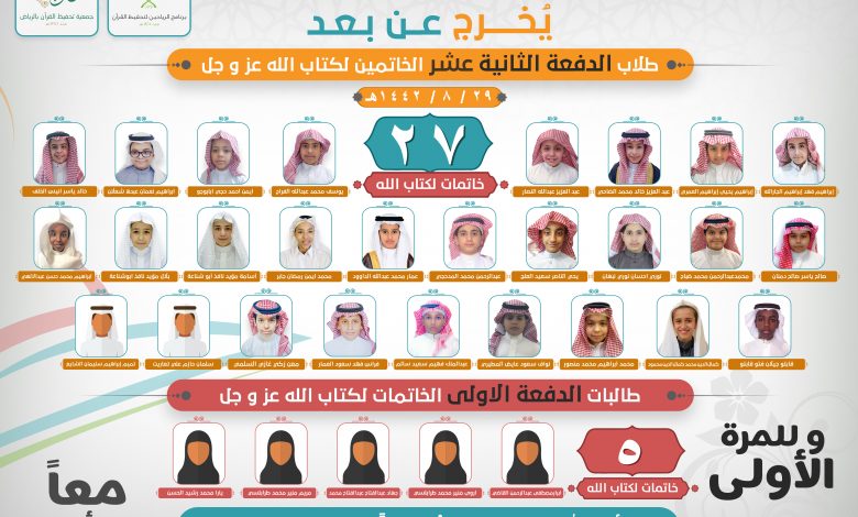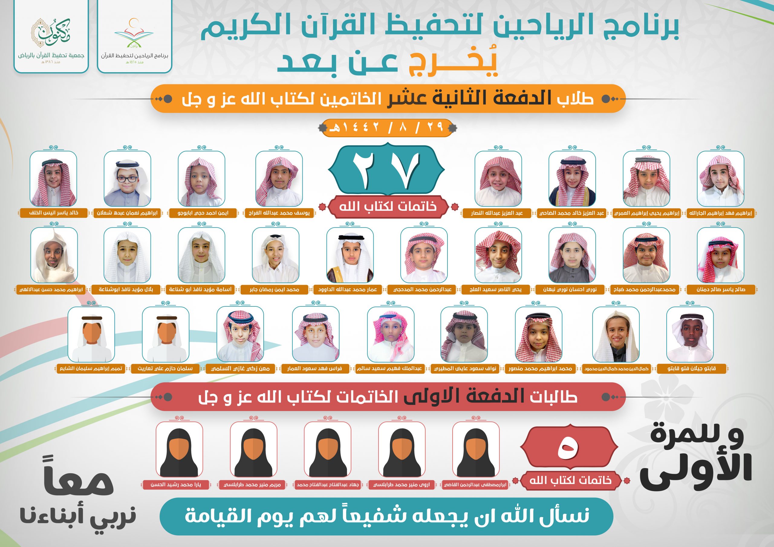 بعد النجاح الكبير الذي حققه العام الماضي من خلال خوضه تجربة “التعليم عن بعد” بتخريج 37 خاتما من البنين، أعلن برنامج الرياحين لتحفيظ القرآن الكريم بجمعية تحفيظ القرآن الكريم بالرياض” مكنون”، ولأول مرة عن تخريج 5 خاتمات ضمن طلاب الدفعة الثانية عشرة لهذا العام 1442هـ البالغة 32 خاتما وخاتمة، بمعدل 27 خاتما و5 خاتمات.