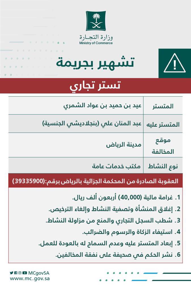 ونشرت الوزارة الحكم القضائي الصادر من المحكمة الجزائية بالرياض والمتضمن تغريم المخالفين 40 ألف ريال، وإغلاق المنشأة وتصفية النشاط، وإلغاء الترخيص، وشطب السجل التجاري، ومنع المتستر من مزاولة النشاط التجاري، واستيفاء الزكاة والرسوم والضرائب، وإبعاد المتستر عليه عن المملكة وعدم السماح له بالعودة إليها للعمل، والتشهير عبر نشر الحكم في صحيفة على نفقة المخالفين.