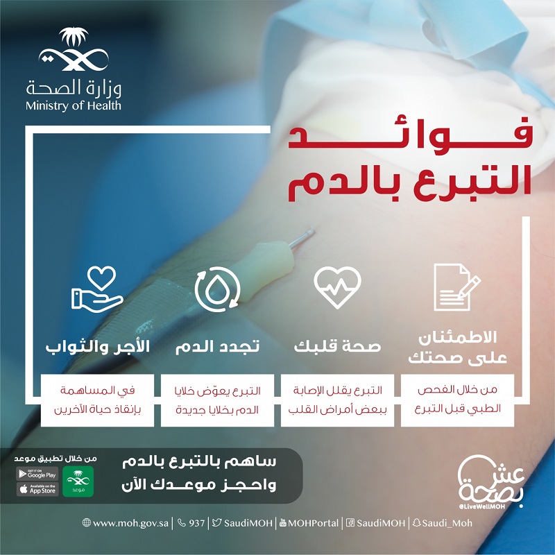 وأوضحت الصحة، عبر حسابها الرسمي بموقع تويتر، أن من فوائد التبرع بالدم الاطمئنان على الصحة من خلال الفحص الطبي قبل التبرع، وكذلك صحة القلب لأن التبرع يقلل الإصابة ببعض أمراض القلب.