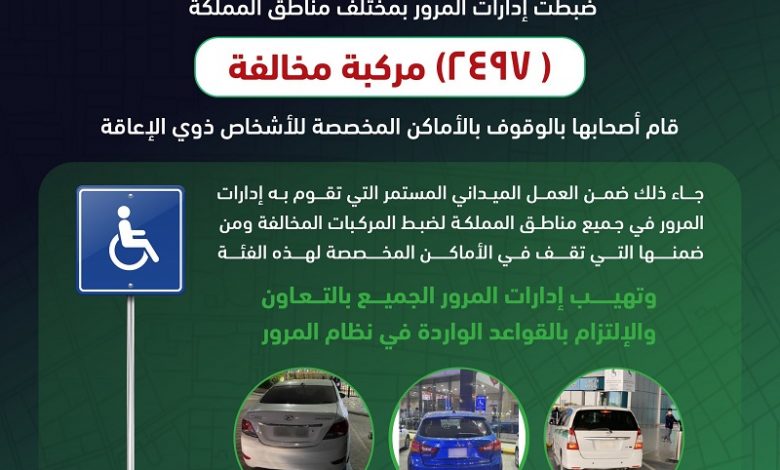 وذكر المرور عبر حسابه الرسمي على موقع “تويتر” أنَّ إدارات المرور بمختلف مناطق المملكة ضبطت 2497 مركبة قام أصحابها بالتوقف في أماكن الأشخاص ذوي الإعاقة، موضحًا أن ذلك يأتي ضمن العمل الميداني الذي تقوم به إدارات المرور.