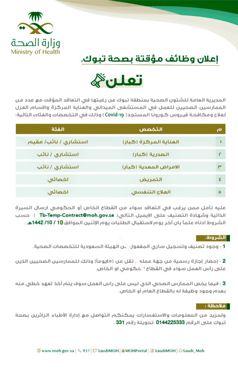 أعلنت المديرية العامة للشئون الصحية بمنطقة تبوك عن رغبتها في التعاقد المؤقت مع عدد من الممارسين الصحيين للعمل في المستشفى الميداني والعناية المركزة وأقسام العزل لعلاج ومكافحة فيروس كورونا المستجد (19-Covid)، وذلك وفقاً للتفاصيل الموضحة أدناه.