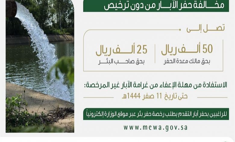 وأوضحت أن مخالفة حفر الآبار دون ترخيص تصل إلى 50 ألف ريال بحق مالك معدة الحفر، و25 ألف ريال لصاحب البئر.