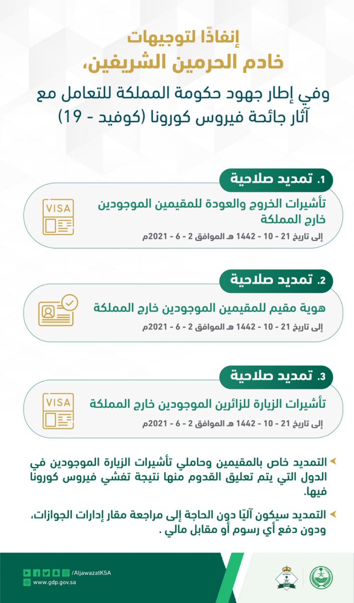 أولًا: تمديد صلاحية الإقامات وتأشيرات الخروج والعودة للمقيمين الموجودين خارج المملكة في الدول التي يتم تعليق القدوم منها نتيجة تفشي فيروس كورونا فيها، ليكون إلى تاريخ 21 / 10 / 1442هـ الموافق 2 / 6 / 2021م.