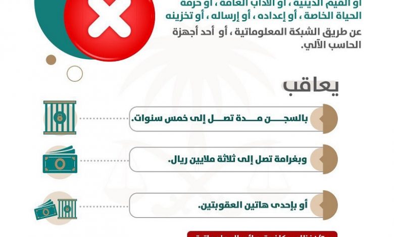 وحذّرت من إنتاج ما من شأنه المساس بالنظام العام أو القيم الدينية أو الآداب العامة أو حرمة الحياة الخاصة أو إعداده أو إرساله أو تخزينه، عن طريق الشبكة المعلوماتية أو أحد أجهزة الحاسب الآلي.