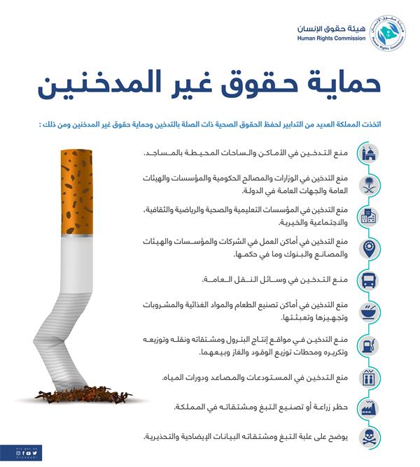 أكدت هيئة حقوق الإنسان أن المملكة اتخذت العديد من التدابير الصحية ذات الصلة بالتدخين لحماية حقوق غير المدخنين، بما في ذلك منع تسجيل براءات اختراع لها علاقة بزراعة وصناعة وتجارة التبغ ومشتقاته.