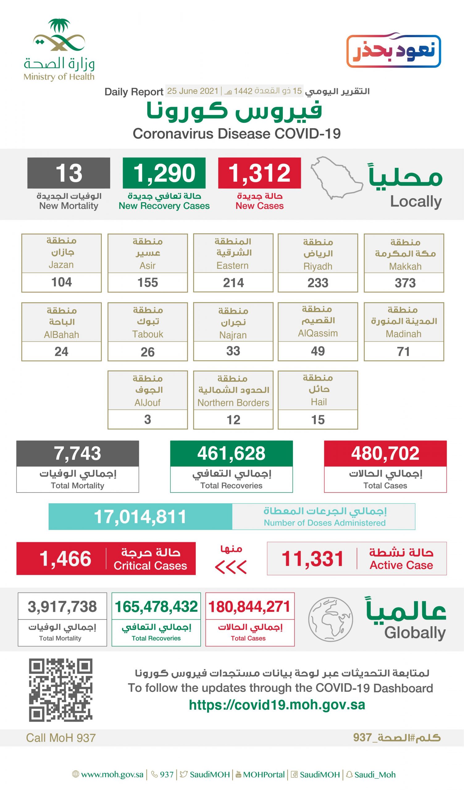 وقالت الوزارة إنه تم تسجيل 1290 حالات تعافٍ جديدة ليصبح الإجمالي 461,628 حالة ولله الحمد.