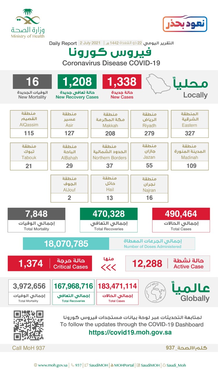 وقالت الوزارة إنه تم تسجيل 1208 حالات تعافٍ جديدة ليصبح الإجمالي 470,328 حالة ولله الحمد.