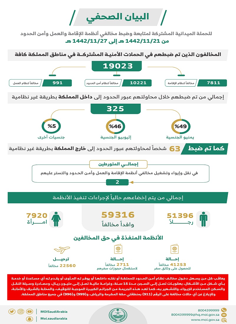 أسفرت الحملات الميدانية المشتركة لمتابعة وضبط مخالفي أنظمة الإقامة والعمل وأمن الحدود، التي تمت في مناطق المملكة كافة، وذلك للفترة من 21 / 11 / 1442 هـ الموافق 1 / 7 / 2021 م حتى 27 / 11 / 1442هـ الموافق 7 / 7 / 2021م، عن النتائج التالية : –